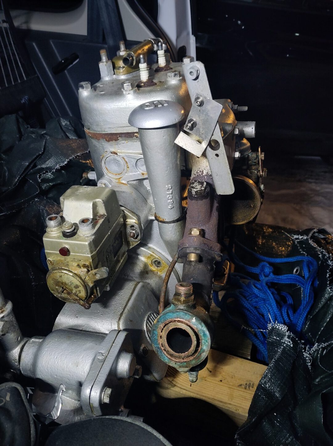Kurz zum Hintergrund und Zustand: Im Jahr 2023 haben wir unsere Hallberg P28 gekauft, in welcher dieser Motor montiert war. Der Verkäufer hat den Motor im Jahr 2021 nach eigenen Angaben umfassend saniert. Tatsächlich lief der Motor die ganze Saison über gut. Am Ende der Saison hat sich die Mechanik des Verstellpropellers verstellt und ich habe den Motor eingewintert ohne ihn zu reparieren. Wegen beruflicher Gründe und der Geburt unseres Sohnes habe ich die Reparatur verschoben und wir sind 2024-2025 nicht gesegelt. Vor allem weil mir der Verstellpropeller zu tüdelig war, habe ich beschlossen den Motor nicht zu reparieren, sondern auszubauen. Um zur Saison 2026 startklar zu sein, habe ich den Motor Ende Januar 2026 ausgebaut und in mein Auto verfrachtet. Dort liegt er gerade, daher auch die schlechten Bilder. Beim Ausbau ist mir aufgefallen, dass der Motor in den zwei Jahren Korrosion angesetzt hat. Vor allem die Kabel waren betroffen. Daher habe ich alle Kabel einfach abgezwickt. Die Verbindung zum Auspuff konnte ich nicht lösen, daher habe ich das Kupferrohr abgesägt. Wenn ich das Schwungrad drehe, höre ich, dass er komprimiert. Weil ich den Motor alleine ohne Kran ausbauen musste, war der Ausbau nicht die sanfteste Aktion und er ist auf jeden Fall einmal auf den Boden gefallen.